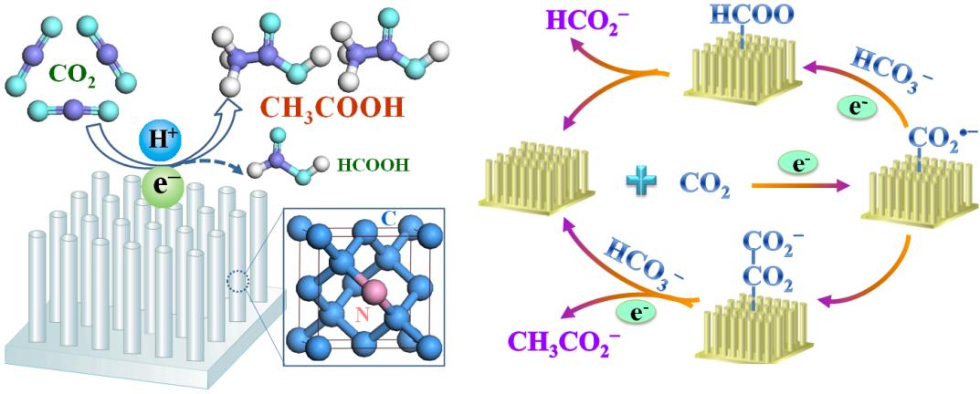 电催化CO2转化为有价值的化合物可以在减少温室气体CO2积累的同时实现废物资源化利用。利用CO2、H2O和可再生能源供电合成小分子燃料或化合物对发展可再生能源经济具有重要意义。目前电还原CO2的瓶颈是CO2还原速率慢、过电位高、发生严重的析氢副反应导致电流效率低、生成的产物种类繁多(C1: CO, CH4, CH3OH, HCOOH. C2: C2H4, C2H5OH, CH3COOH等)。全燮教授指导的博士研究生刘艳明等人通过氮掺杂调控金刚石的析氢过电位和电还原活性,实现了将CO2快速、选择性地转化为乙酸,克服了现有电极C2产物选择性低的问题;且电还原CO2的电流效率高达91.2~91.8%。NDD高效的电还原CO2性能主要归因于三方面:(1)氮掺杂(尤其是N-sp3C基团)引入缺陷位点、引起相邻碳原子电荷和自旋密度变化,促进CO2的吸附、电催化反应和中间产物CO2•─的形成、从而提高C2产物的生成速率和选择性;(2)NDD高的析氢过电位能提高电还原CO2的电流效率:(3)垂直阵列能提供更大的反应面积和直接的电子迁移通道。电化学动力学和原位红外光谱分析表明CO2还原的机理为CO2→CO2·−→(COO)2·→CH3COO−.该工作发表于J. Am. Chem. Soc. (2015, 137, 11631-11636)。