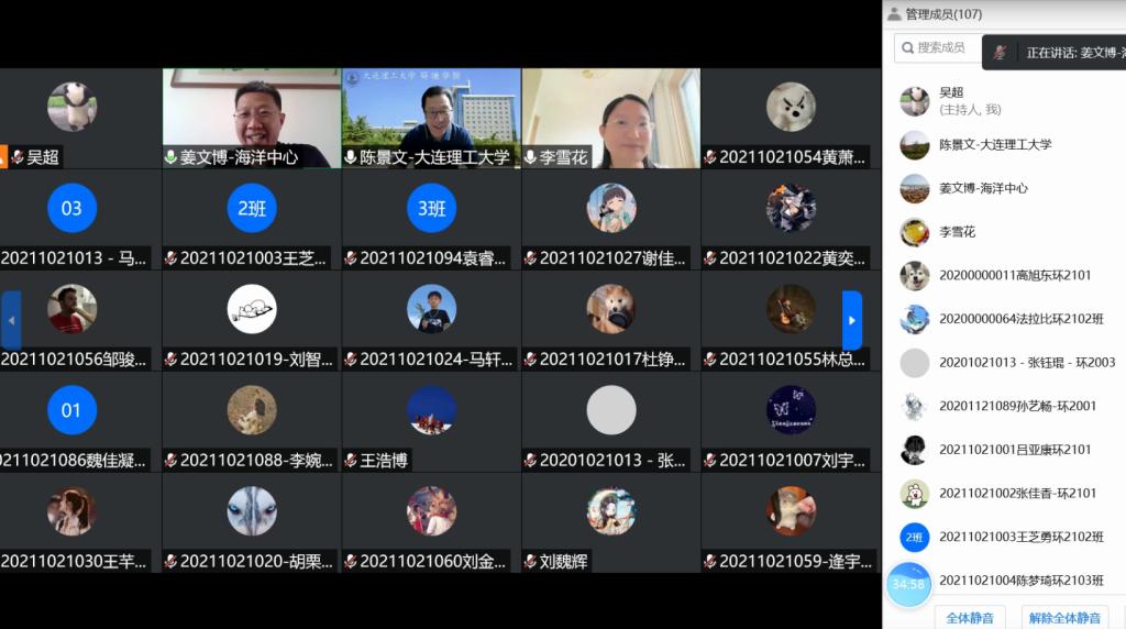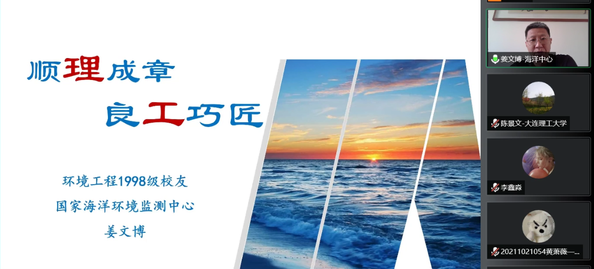1998级校友姜文博在国家海洋环境监测中心工作,现任生态环境监测与质控处处长,正高级工程师。他以“顺理成章 良工巧匠”为题,回忆了紧张、进步、追求卓越的大学生活,感恩母校的培养。向同学们分享了9802班“非淡泊无以明志,非宁静无以致远”的班级座右铭,介绍了自己所在的优秀班集体。以勤奋、奉献、视野、严谨、韧劲、责任、逻辑、团结、珍惜为主题词,向同学们分享了自己的发展经验和感悟,祝大一同学取得更好的发展。