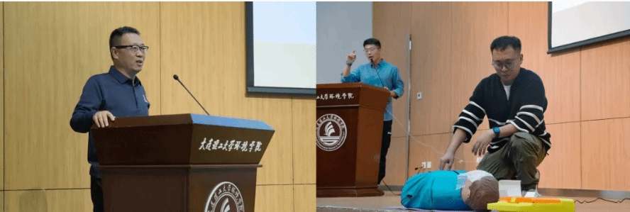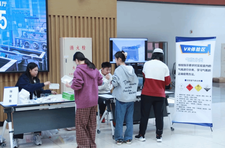 在活动中,大连大特气体有限公司专家以实验气瓶使用安全为例,结合事故案例,从合规购买、合理使用、风险管理、应急处置以及现场救援人员救治常用方法等方面进行了集中培训;以气瓶硫化氢泄漏为背景,按照应急处置预案,对事故发现、信息报告、疏散警戒、人员抢救、险情控制、现场善后等环节进行了模拟演练,并邀请现场师生参与灭火器、灭火毯、自动体外除颤器、心肺复苏术等常用设备和方法进行应用体验;同时,在知渊楼一楼展厅设置应急物品展示及用法讲解、安全与应急知识问答、心肺复苏术学习、VR体验等活动专区,辅助在场师生学习了解安全应急知识和技能。