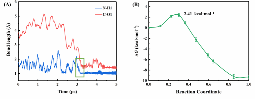 图5 界面电场作用下CH2NH在空气−水界面上水解过程中的关键键长随模拟时间的变化图(A)和自由能曲线图(B)